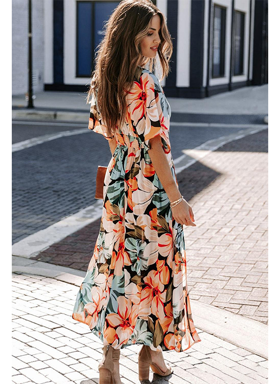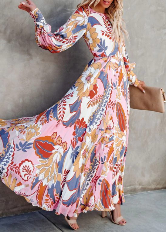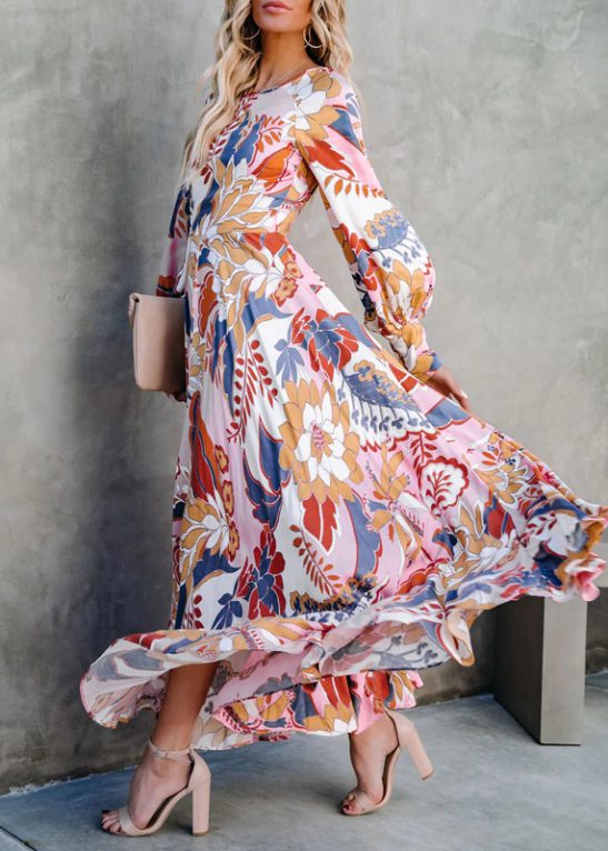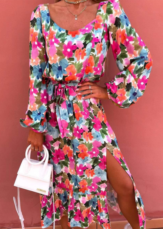 Boat Neck Puff Sleeve Blossom Printed Dress