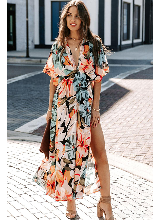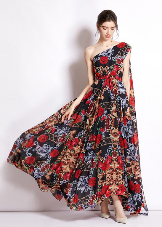 Blossom Printed One Shoulder Lace Up Maxi Chiffon Dress