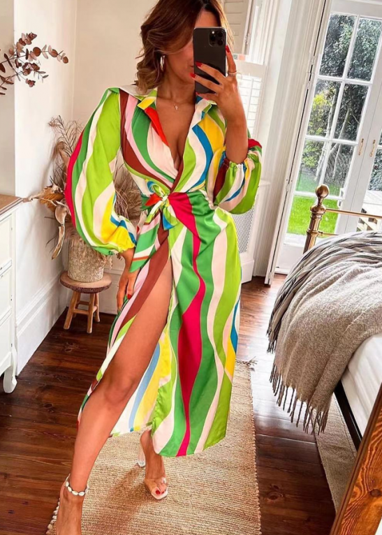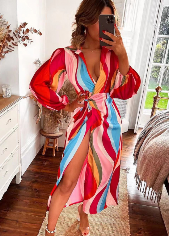 Fashion Printed Lace-up High Waist Slit V Neck Dress