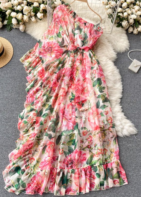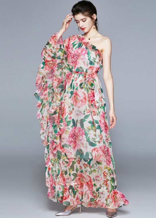 Blossom Printed One Shoulder Lace Up Maxi Chiffon Dress