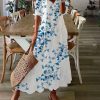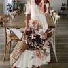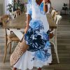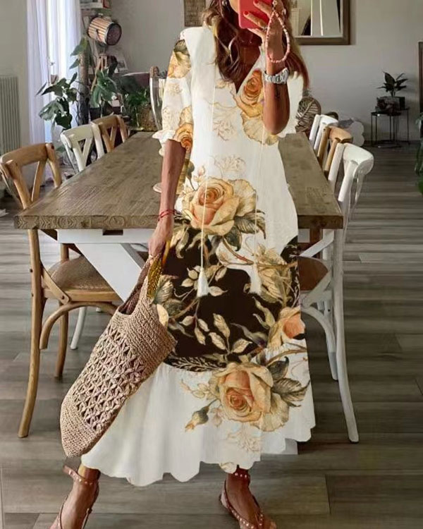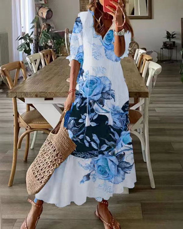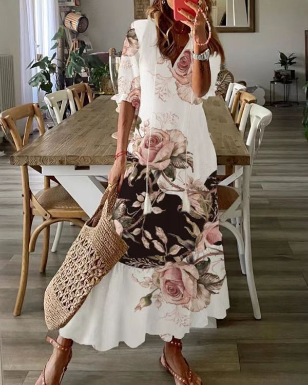Bohemian V Neck Fringed Short Sleeve Floral Long Dress