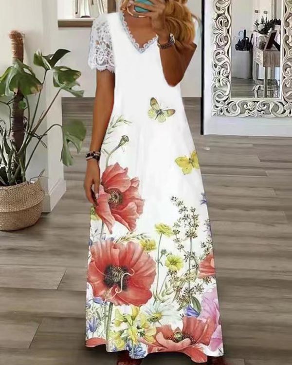 Casual V Neck Lace Short Sleeve Floral Dress