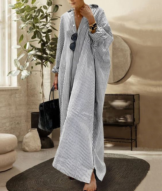Comfort Stripe Long Sleeve Loose Shirt Long Dress