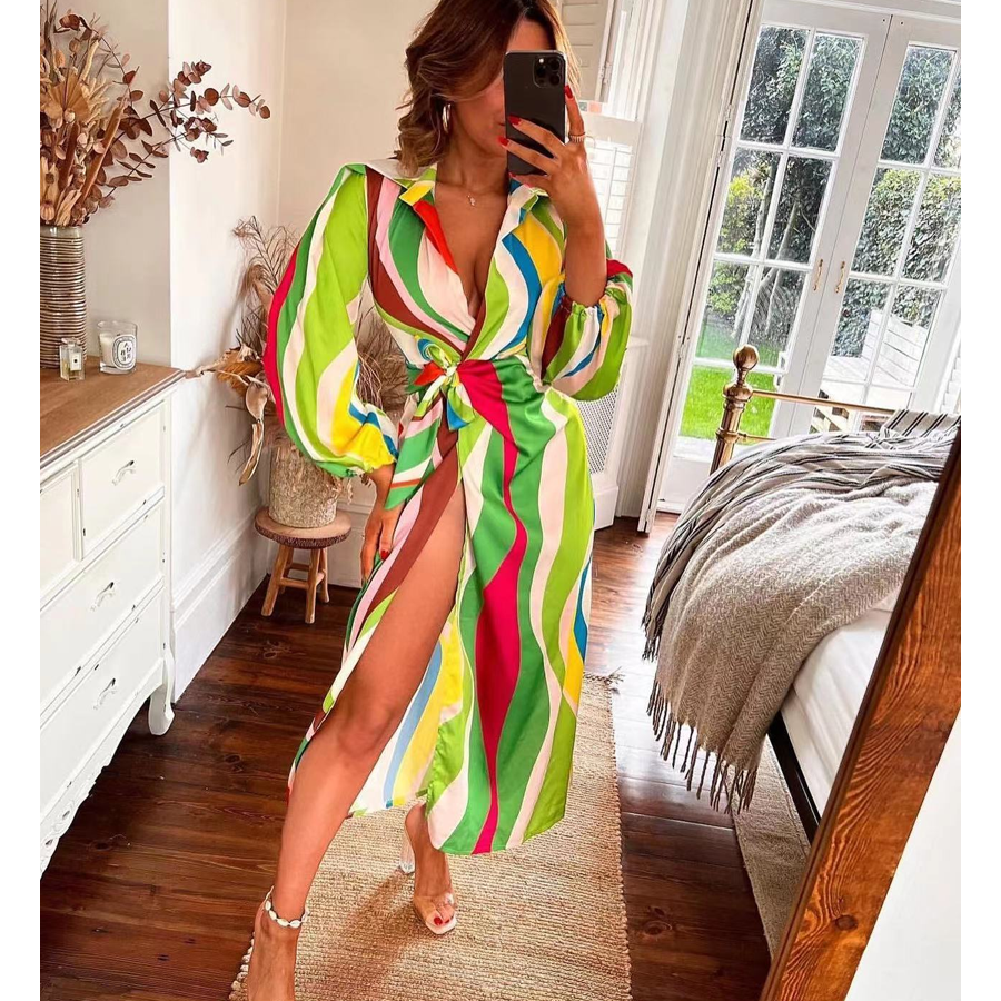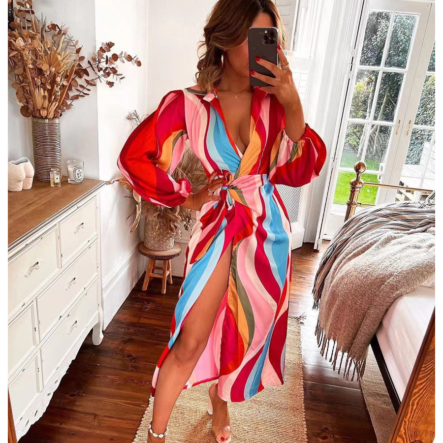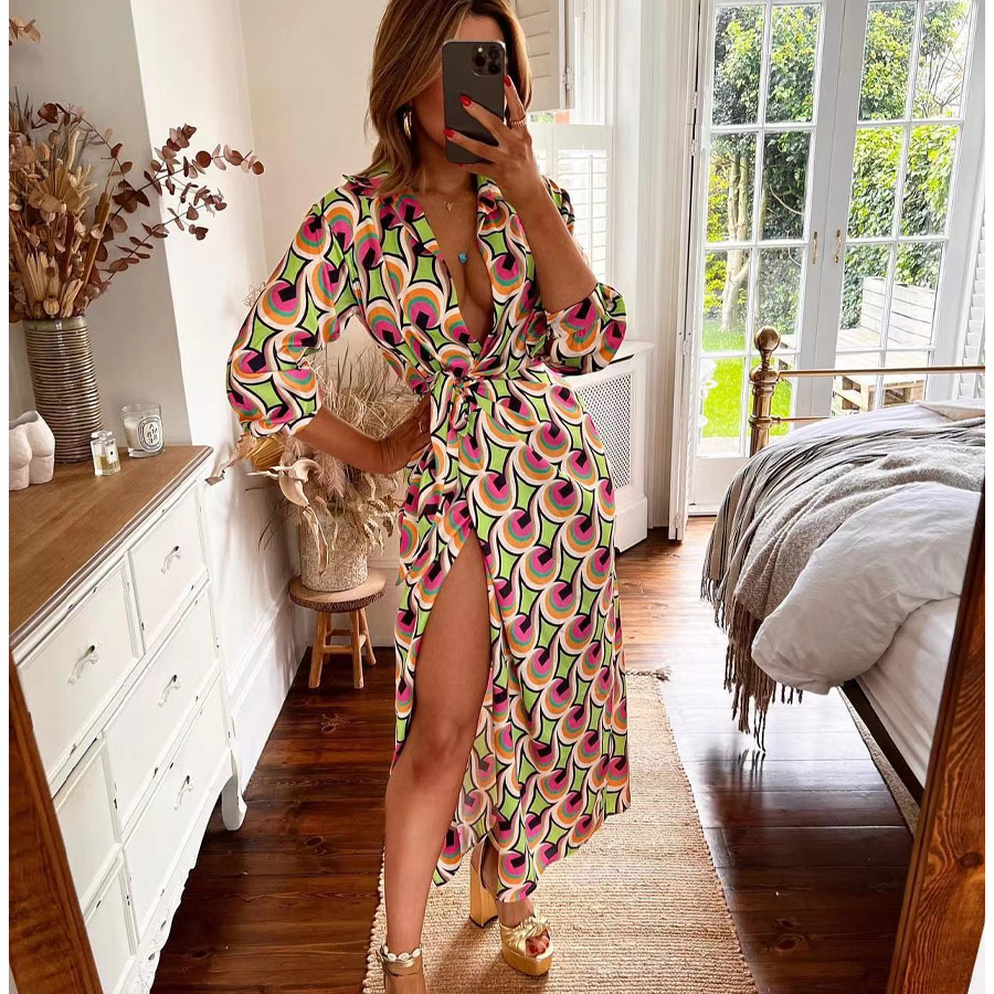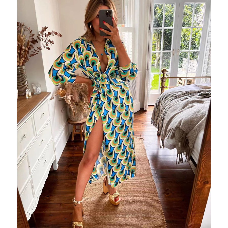 Fashion Printed Lace-up High Waist Slit V Neck Dress