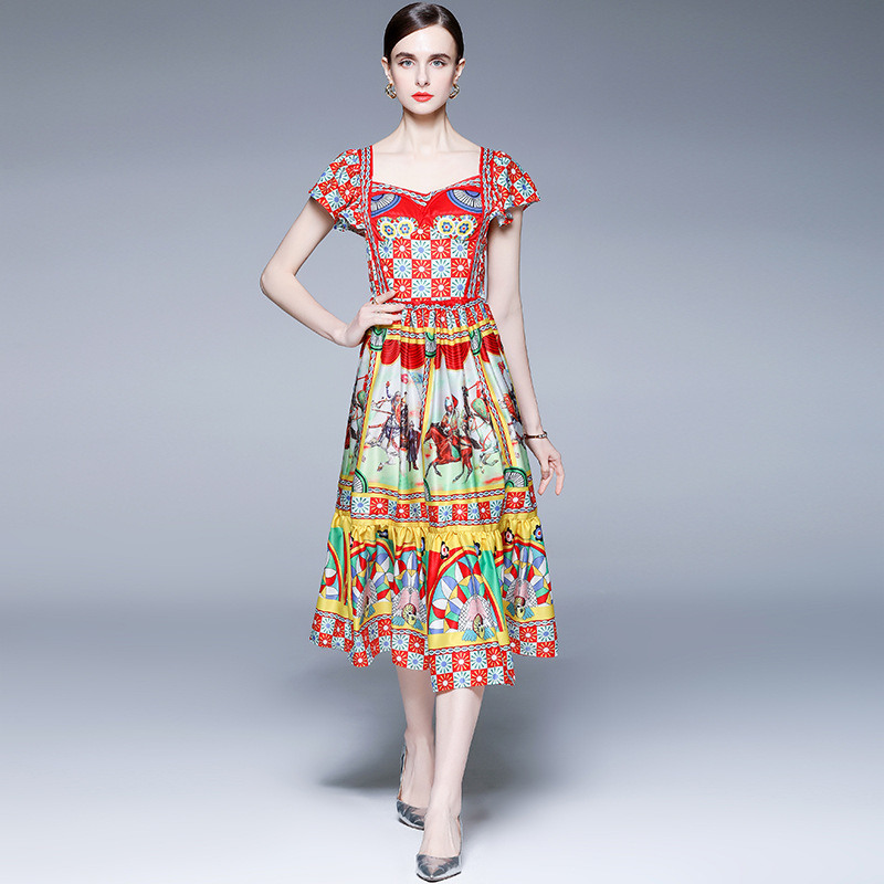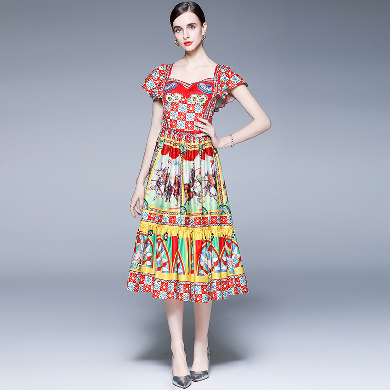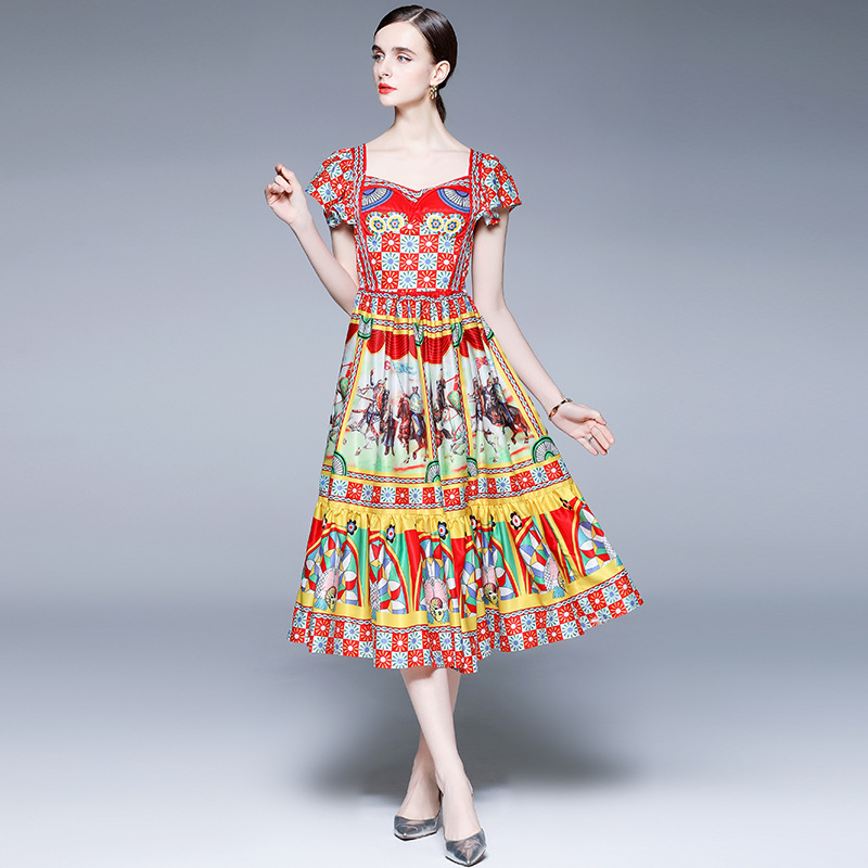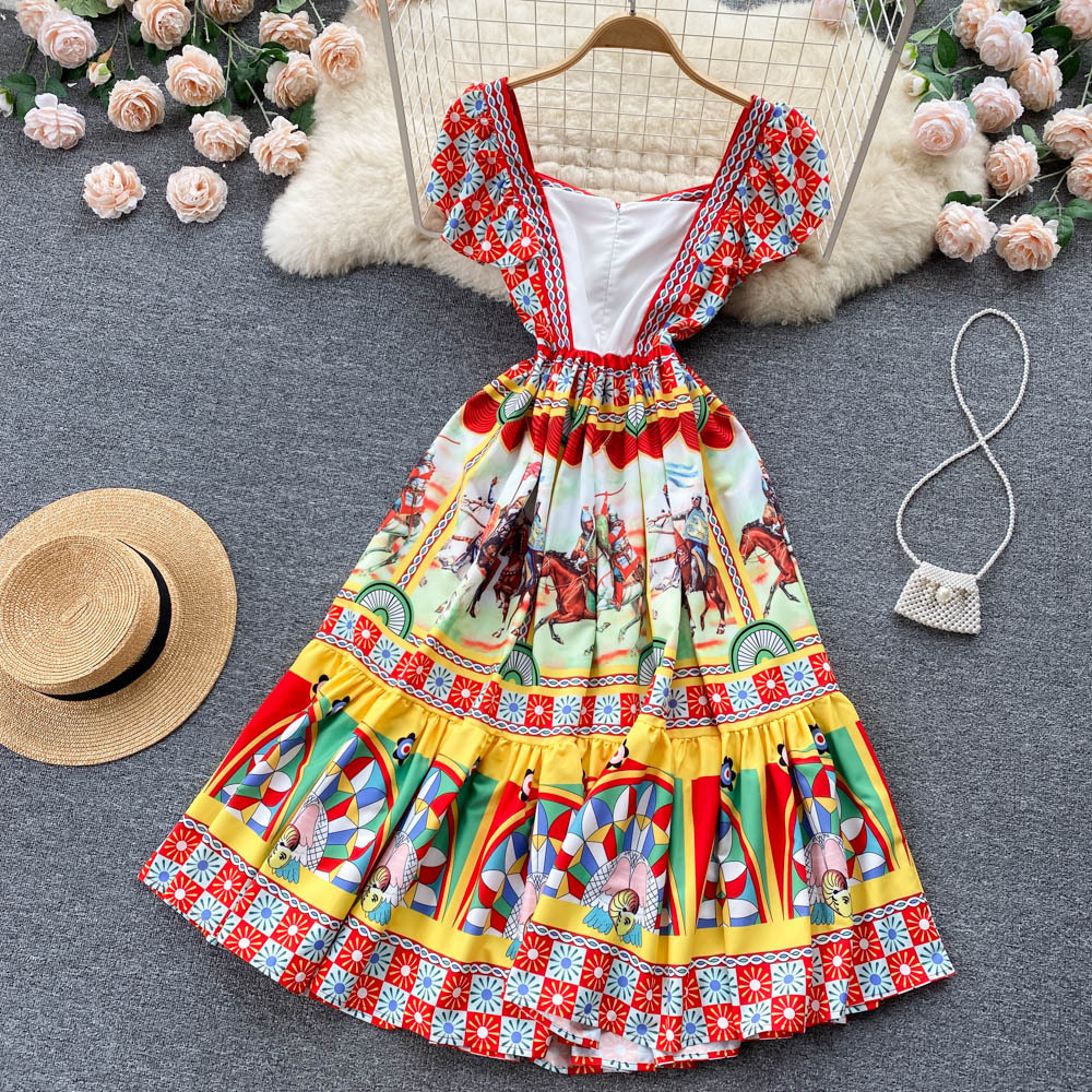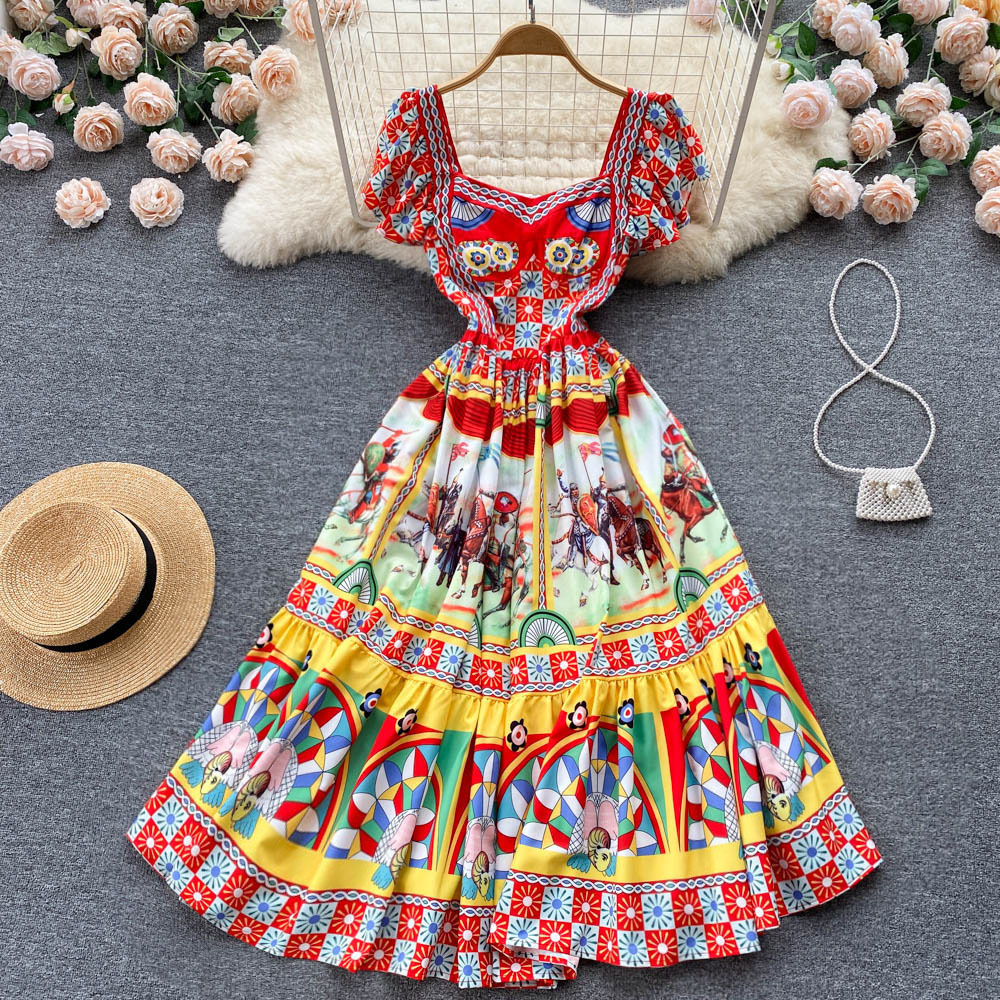 Temperament Vacation Printed Retro Palace Style Waist Dress