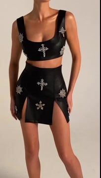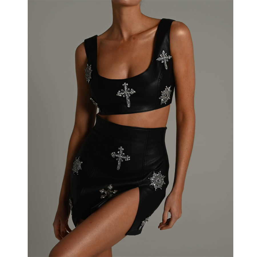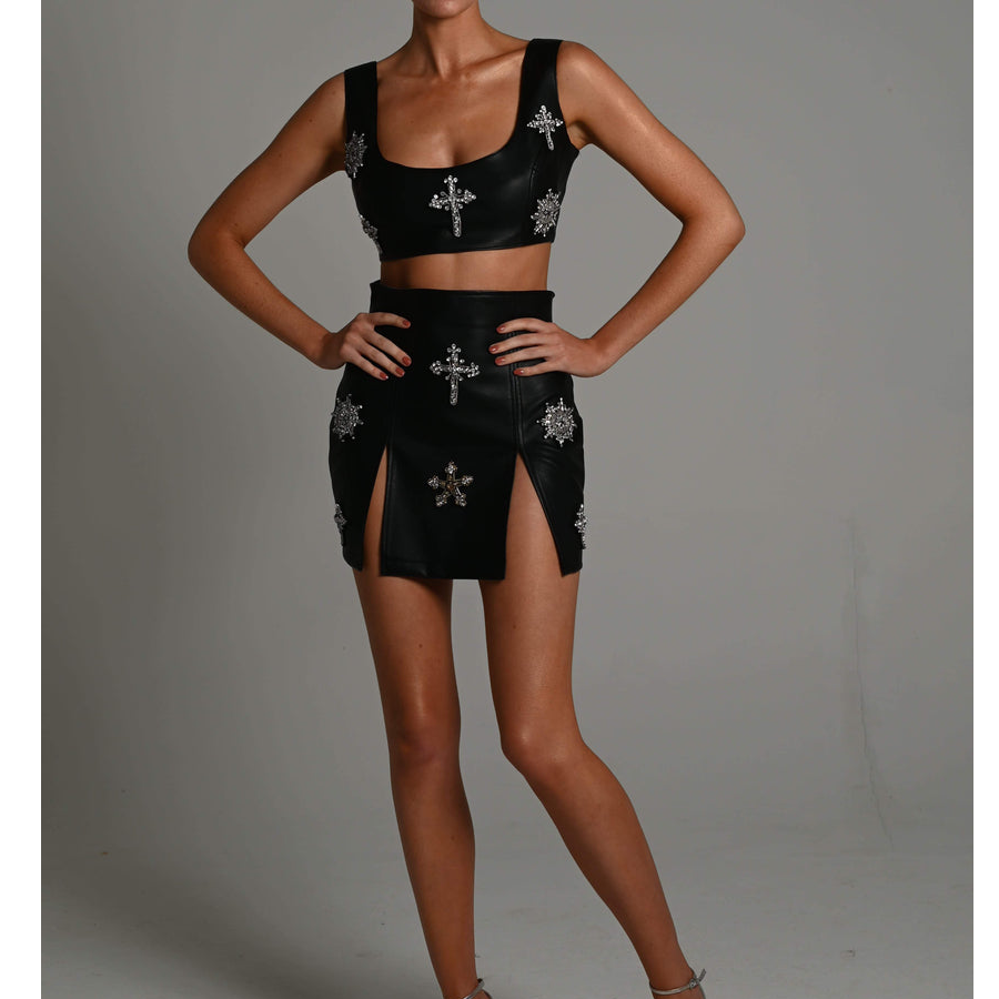 Sexy PU Leather Crop Skirt Two Piece Set