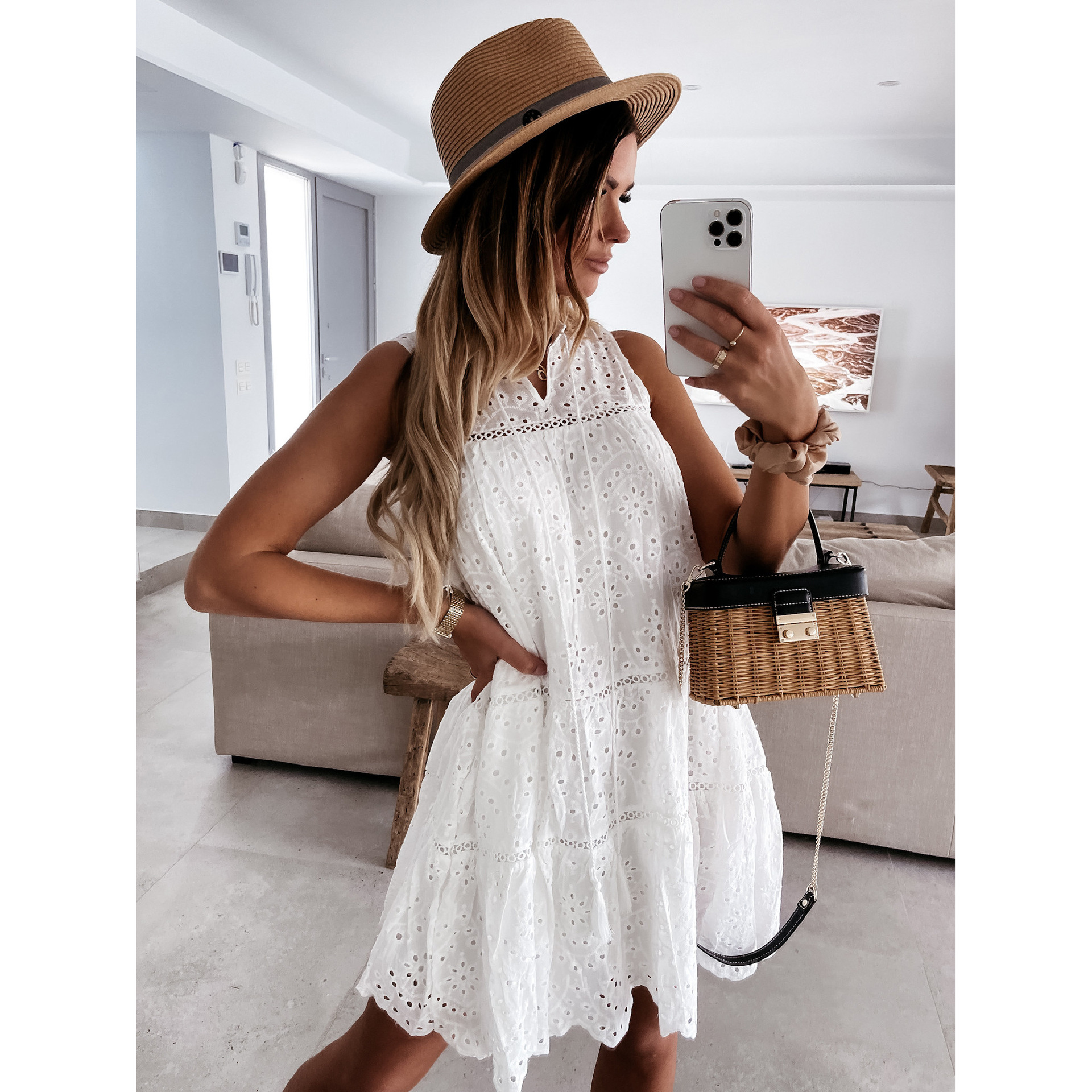 Cut Out V Neck Lace Mini Dress