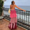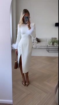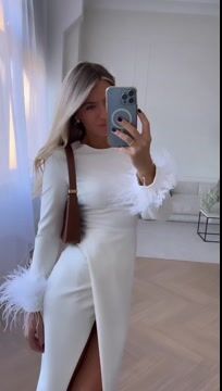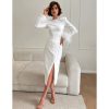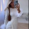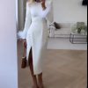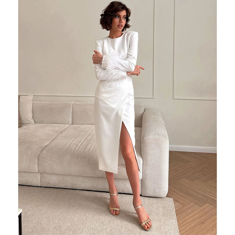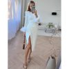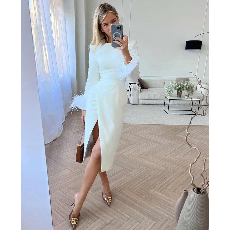 Slit Round Neck Feather Long-sleeved Dress