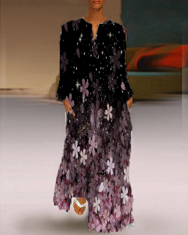 Women’s Elegant Long Sleeve Flower Print Casual Long Dress