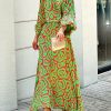 Women’s printed linen short sleeve V-neck medium length dress
